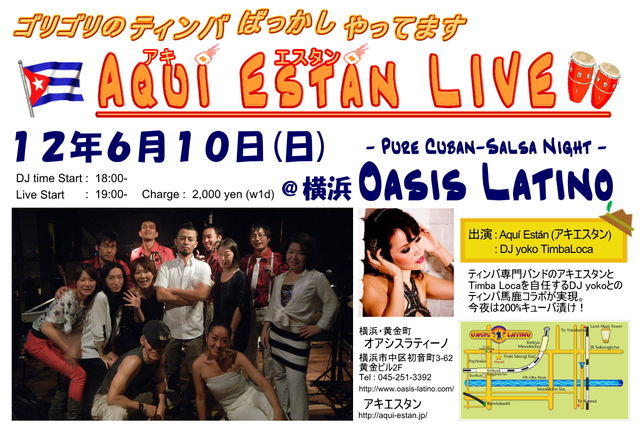 ☆彡 6/10(日) アキエスタン ライブ@横浜オアシスラティーノ キューバンティンバ バンド アキエスタンは、 6/10の日曜日。梅雨空を吹き飛ばしに、 横浜でかまさせて頂きます! 場所は、黄金町オアシスラティーノ。 パワーアップしたアキエスタンで、再び横浜のみなさんの腰を震わせます。 今回はゲストDJに、キューバンティンバを華麗に放つ、 浜の新星美女DJ yoko☆Timba Locaさんを迎えます。 サルサ初めてみようかな…、という人も キューバンスタイルも踊ってみたいかも…、という人も やっぱキューバンが燃えるのよね
