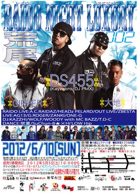 管理人様貴重なスペース失礼いたします。 荒尾にAK-69, ZANG HAOZIを迎えてから約9ヶ月、、、またあのイベントが2012年6月10日(日)荒尾で開催決定!! 今回のスペシャルゲストは、ロコハマこと横浜からDS455[DJ PMX, Kayzabro]!! そしてなんとGIPPER, 大地の参戦も決定し、濃い内容になること間違いなし!! 2012年6月10日(日)は、グリーンランド遊園地前の荒尾総合文化センターに集合!! チケット売り切れの前にコンビニへダッシュ!! RAIDO NIGHT LUXURY 002 レイドナイトラグジュアリー 会場 荒尾総合文化センター小ホール (グリ