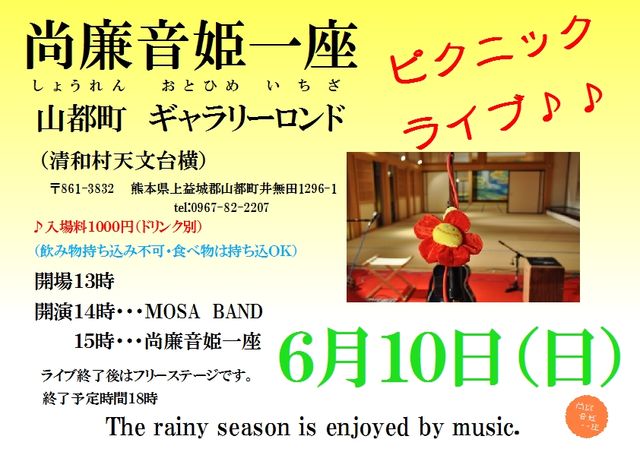 「尚廉音姫一座 ピクニックライブ」 日時 6月10日(日) PM 2:00〜 終了予定PM 6:00 場所 ギャラリーロンド(野外ライブ) (清和村 天文台横) 入場料 1000円 *飲み物持ち込み禁止 (中で缶ジュース・ビール等を販売しています) *食べ物持ち込みOK 地元バンド「MOSA BAND」とのジョイントライブ。 ライブ終了後は、ステージフリータイム! どなたで