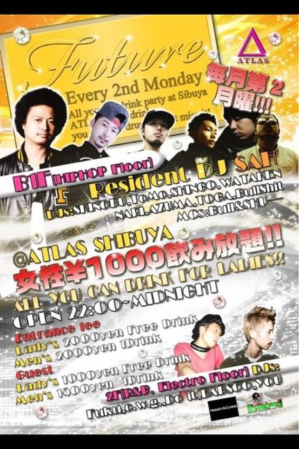 管理人様、告知失礼します。 ※ディスカウント情報※ もしメッセージができない、急に行きたくなった方は 渋谷アトラスのエントランスにて 「シンゴのゲストでマスター」 と言って頂ければ、何名様でもディスカウントゲストにて入場できます。 ------------------------------------------------------------------------------------------- 毎週月曜日は!! 渋谷axxcisの姉妹店でATLASで、 「FUTURE」!! 毎週かなりの人でにぎわっている女性飲み放題HIPHOP,R&Bイベント!! 2フロアOpenでしっかり楽しめる