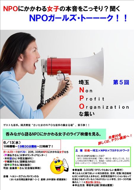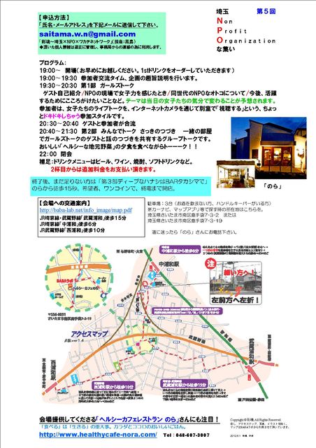 呑みながら語るNPOにかかわる女子のライブ映像を見たいか!! 第5回さいたまNPOな集い 今回のテーマは「NPOガールズトーク」 期日:2012年6月13日(水) 開始19:30(開場:19:00) 会場:「ヘルシーカフェレストランのら」(さいたま市南区) http://baba-lab.net/info_image/map.pdf 注意:上記地図はお店と隣のBABAラボ兼用です。地図にある電話はお店のものではありませんのでかけないで下さい。 最寄駅:JR武蔵浦和、中浦和、西浦和(もっとも近いのは中浦和です。五差路で迷われる方が多いです。赤い自販機