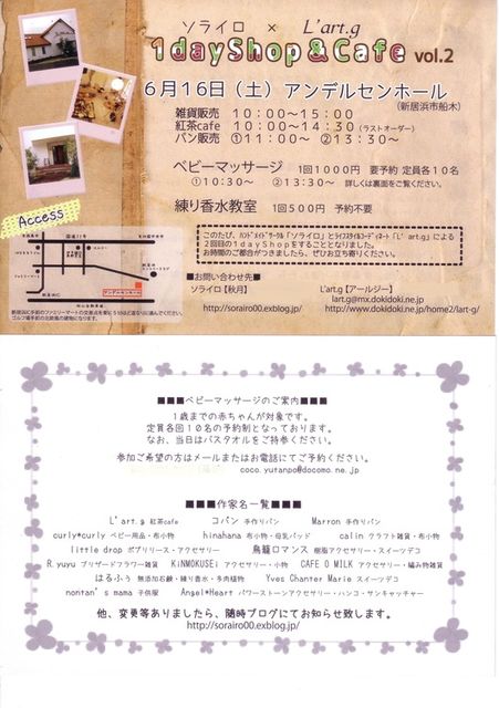 ソライロ × L'art.G 1day shop & cafe vol.2 6月16日(土) アンデルセンホール(新居浜市船木1194−1) http://www.swcl.jp/a-hall/index.html 雑貨販売 10:00〜15:00 紅茶cafe 10:00〜14:30(ラストオーダー) パン販売 ?11:00〜 ?13:30〜 各教室も開催します。 ♪ベビーマッサージ 助産師の藤田さんが講師です。 1回1000円 要予約 定員各10名 ?10:30〜 ?13:30〜 1歳までの赤ちゃんが対象となります。