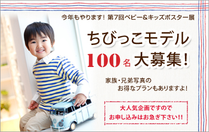 イオン福島店(旧サティ)の近くにある写真館、白いアトリエでは 6月に第7回ベビー&キッズポスター展を「こむこむ」で開催いたします。 そこでポスター展に参加していただけるちびっこモデルを募集しています。 ポスターは展示終了後にプレゼントいたします。 お気に入りの普段着でお子様の自然な表情をスタイリッシュなポスターにデザインします。 参加費 : お子様お一人 5,250円 ※475×320mmのポスターをプレゼント 当店通常価格 14,700円の内容です ※ご兄弟でお申し込み