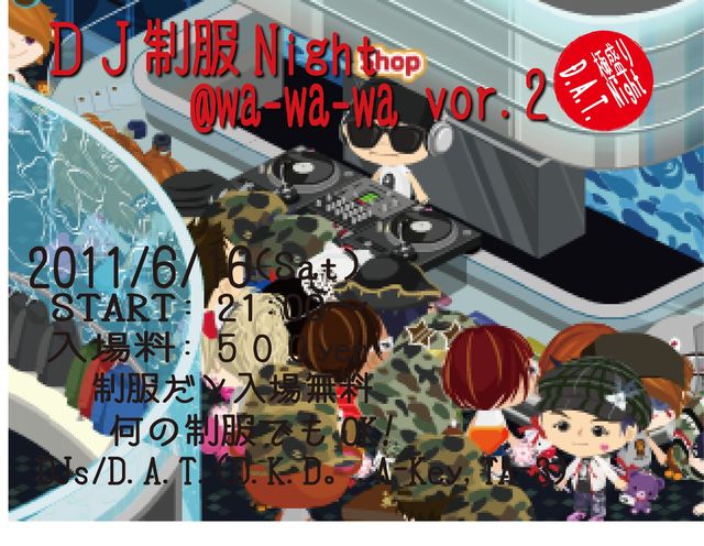 告知失礼します 6月のDJイベントは、お待ちかねの「DJ制服Night@wa-wa-wa」です 前回大好評だったスペシャルイベント!! 制服だったらなんでもOK! もちろんDJもスタッフも制服でお待ちしてます Start/21:00〜 入場料/\500- 制服で来れば無料 Djs/D.A.T.(D.K.D。,A-Key,TA-3)