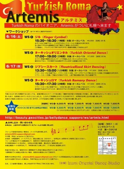 管理人様。貴重なスペースをお借り致します。 北海道のベリーダンサーの皆様にお知らせです ジプシーダンス、そしてターキッシュ・ロマ・スタイルの第一人者であるアルテミスが札幌でワークショップ を開催することになりました ギリシャとトルコの血を引き、現地での調査や踊りの研究に40年のキャリアを持ち、「世界のダンス人名事典」において「ベリーダンス」の項目でも紹介され、 またIAMED(国際中東ダンスアカデミー)の認定する‘最優秀民族舞踊家’及びザガリート誌の選ぶ「最も広く知られた民族舞踏家」にも選ばれているAr