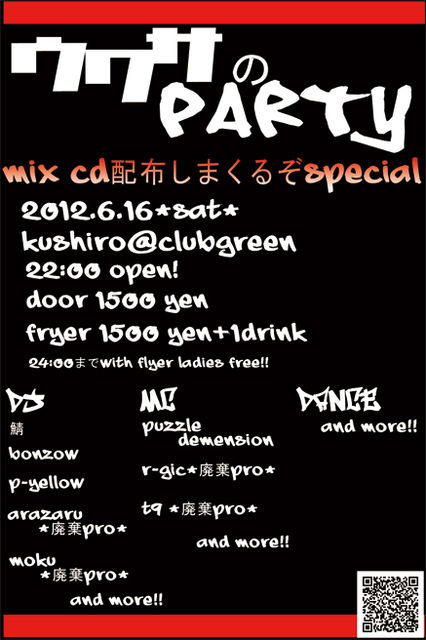 告知失礼します。 踊りたいなら来るしかない!!! HipHop聴くなら来るしかない!!!! 釧路ClubGREENでお待ちしております。 ウワサのParty Vol.13 2012.6.16(sat) @釧路ClubGREEN 22:00 open door \1500- fryer \1500 + 1drink ※フライヤー持参の女性は24:00まで入場無料!! mixCD配布しまくるぞSpecial!!!!! DJs 鯖 BONZOW P-YELLOW アラザル(廃棄pro.) and more!! MCs PUZZLE DIMENSION R-GIC(廃棄pro.) T9(廃棄pro.) ナランチャ(廃棄pro.) and more!! DANCE and more!! ウワサのPartyコミュニティー