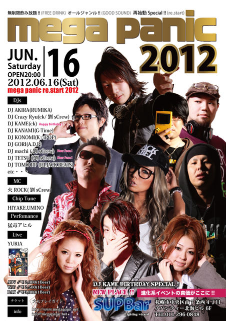 【緊急告知 !! mega panic re.start 2012 電撃開催決定 !!】 「流浪(るろう)の無制限飲み放題イベントmega panicです。この度、2012年6月に新規オープン予定の「SUP Bar(サップ バー)」のスタッフさん達のご好意により、オープン前に特別の、新たな史上最大の、劇的ビフォーアフターチックな、更なる大進化を遂げ、2012年6月16日(土)の北海道神宮祭真っ只中に開催決定です !!」 いよいよ2012年の新年度の夏目前 !! またまた更なるメガパニの大躍進が始まります !! 進化系イベントの真価がここに !! 札幌21世紀初の、 ☆無制限飲み放題 !