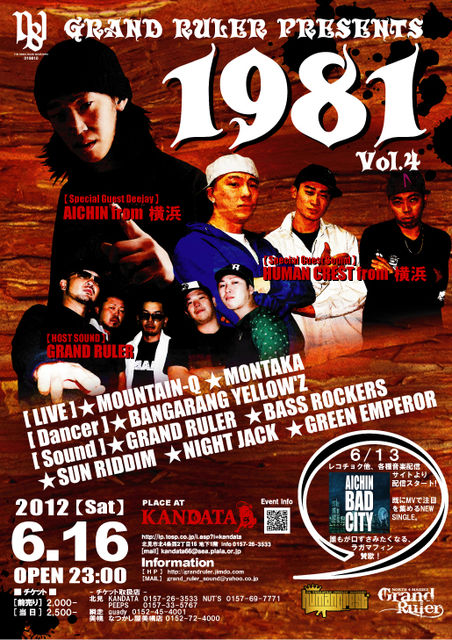 GRAND RULER PRESENTS ★1981 Vol.4★ 2012.06.16(Sat) OPEN/START 23:00 @KANDATA - SPECIAL GUEST LIVE - ■AICHIN【横浜】 - SPECIAL GUEST SOUND - ■HUMAN CREST【横浜】 - LIVE - ■MOUNTAIN-Q【旭川】 ■MONTAKA【札幌】 - DANCER - ■BANGARANG YELLOW'Z【旭川】 - SOUND - ■BASS ROCKERS【釧路】 ■SUN RIDDIM【旭川】 ■NIGHT JACK ■GREEN EMPEROR -Host Sound- ■GRAND RULER - Ticket - 前売り \2,000- 当日 \2,500- - 販売店 - 北見 KANDATA/NUT'S/PEEPS 網走 g