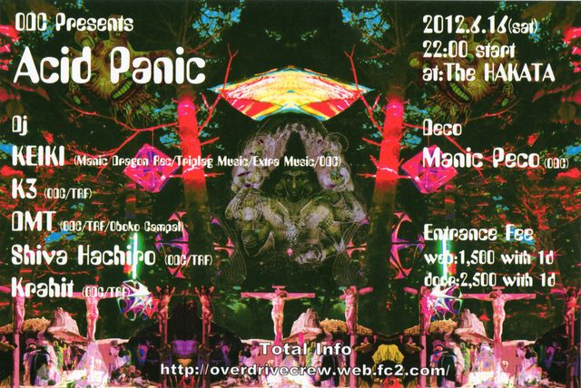 ODC Presents Acid Panic 2012/6/16(sat) 22:00 Start @The Hakata (札幌市中央区) 【 dj set 】 KEIKI (Manic Dragon Rec/Triplag Music/Extra Music/ODC) K3 (ODC/TRF) DMT (ODC/TRF/Oboko Campal) Shiva Hachiro (ODC/TRF) Krahit (ODC/TRF) 【 deco 】 Manic Peco (ODC) 【 food 】 適当屋 【 entrance fee 】 web割: \1,500 with 1d 当日 : \2,500 with 1d 【 total info 】 http://overdrivecrew.web.fc2.com/