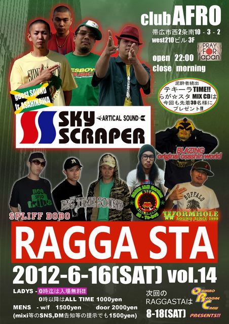 管理人様告知失礼いたします。 たまにはクラブでレゲエなんてどうですか?? 今週土曜はRAGGASTAで身も心もあったまりましょう♪ テキーラタイムで一緒にぶち上がりましょう☆ 以下告知です 偶数月第三土曜といえば帯広REGGAE CREWによるこのイベント!! GUESTに 「SKY SCRAPER fr 旭川」 を迎えてのRAGGA STA!!! しかもしかも!!!! 女の子は0時まで入場無料!!! 0時以降は1000円ポッキリ!! RAGGA STA vol.14 日時 6.16(土) open 22時 morning!! 場所 club AFRO 帯