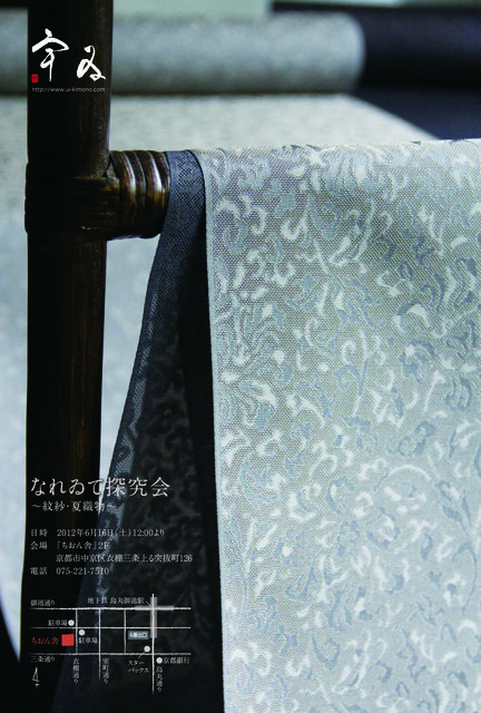 夏のきものは着る機会も実際に箪笥にある数も冬物よりかなり少ないことと思います。 でも、短い期間や少ない機会だからこそ おしゃれで涼感のあるいい素材を着たいものです。 今回探究するのはそんな思いを叶えてくれる織物『紋紗』。 始めてご覧になる方も多いと思います。 繊細で軽やか、透ける織り柄。 そんな紋紗の糸づくりからのこだわりや染め、織りについて 『織座くれはとり』の大江氏に素材の説明をお聞きしながら、 夏織物についてより知っていただきたいと思います。 日時:2012年6月16日(土)12:00〜15:00(頃) 会場:三