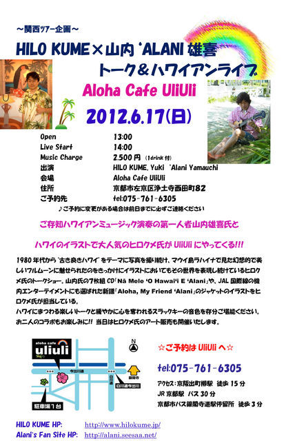 〜関西ツアー企画〜 HILO KUME×山内‘ALANI雄喜トーク&ハワイアンライブ 2012.6.16(土) open 13:00 start14:00 Music Charge 2,500円 (1drink付) 出演 HILO KUME, Yuki ‘Alani Yamauchi 会場 Aloha Cafe UliUli 住所 京都市左京区浄土寺西田町82 ご予約先 tel:075-761-6305 ♪ご予約に変更がある場合は前日までに必ずご連絡ください ご存知ハワイアンミュージック演奏の第一人者山内雄喜氏と ハワイのイラストで大人気のヒロクメ氏がUliUliにやってくる!!! 1980年代から‘古き良きハワイ’をテ