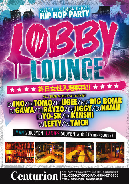 管理人様告知失礼します。 [終日女性入場無料] 毎月第1 & 第3 土曜日開催中 HIP HOP PARTY. LOBBY LOUNGE 2012.6.16(SAT) LOBBY LOUNGE [DJ] GAWA / RAYZO / TOMO / UGEE / JIGGY / NAMU / KENSHI / YO-SK [HOST] BIG BOMB [VJ ] LEFTY / TAICHI [FLOOR DANCER] Яeina / MAYUKA / SAORI / RIE / YUI / MIHO and Mo... ■Doors Open / 22:00 ■料金システム(ENTRANCE FEE) [男性] ¥2,000 [女性] 入場無料 (※入場時別途1Drink代のみ必要) (先着50名様にSELECT CD PRESENT ) [桑名Centu