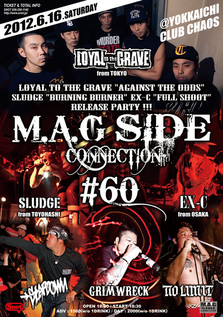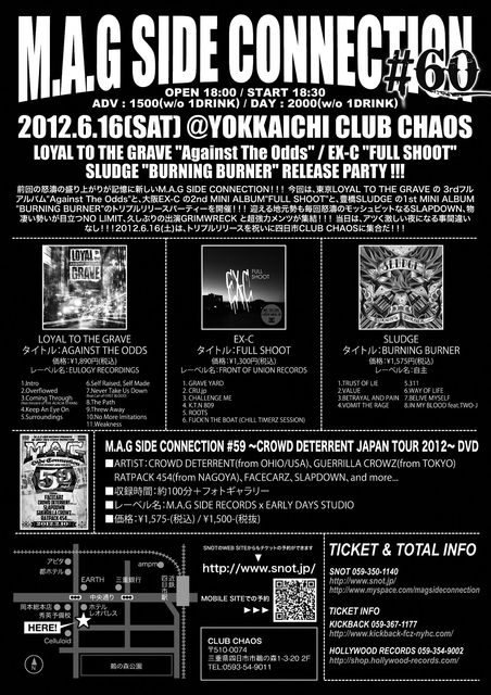 管理人様、告知失礼します。 いよいよ、明後日です!!! M.A.G SIDE CONNECTION #60!!! 〜LOYAL TO THE GRAVE "Against The Odds" RELEASE PARTY!!!〜 〜EX-C "FULL SHOOT" RELEASE PARTY!!!〜 〜SLUDGE "BURNING BURNER" RELEASE PARTY!!!〜 2012.6.16(SAT) @四日市 CLUB CHAOS LOYAL TO THE GRAVE(from TOKYO) EX-C(from OSAKA) SLUDGE(from TOYOHASHI) SLAPDOWN NO LIMIT GRIMWRECK OPEN 18:00 / START 18:30 ADV : 1500(+1D \500-) / DAY : 2000(+1D \500-) TICKET & TOTAL INFO : SNOT 059-350-1