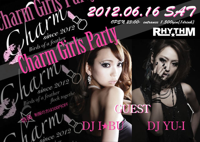 -girls party♡charm- 2012.6.16(sat) at.伊勢RHYTHM OPEN23:00 1500yen(1drink) 名古屋からモデル、タレントとして活躍中のDJ YU-IとDJ★IBUが!制服で来てくれた子にわ特典つき☆ カップルもmen'sももちろん大歓迎! 新しいポップカルチャーが生まれる瞬間をガールズパーティーで開催決定! ファッションとミュージックを軸にガーズルパーティーをガジェット! 今回!当日は名古屋からモデル・タレントとして活躍中のDJ YU-IとDJ★IBU スペシャルゲストとして出演が決定している! フロアに溢れるJ-POP、ハウス、テクノ、エレクトロ、さ