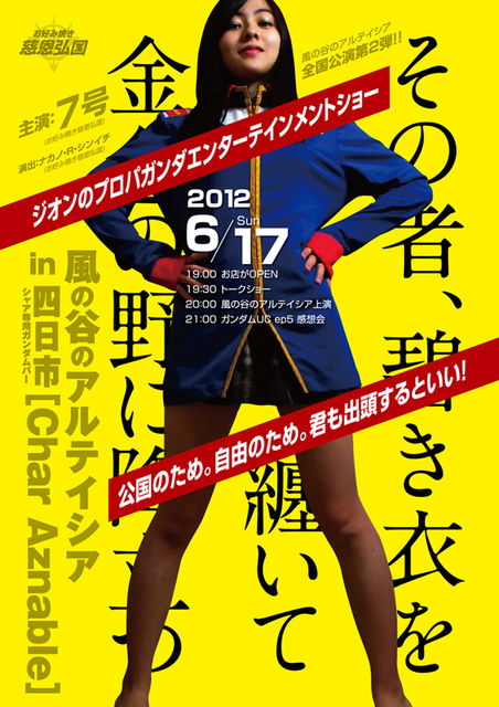 ★★☆「風の谷のアルテイシア」四日市公演決定!☆★★ あの、恐れ知らずの冒険活劇一人芝居「風の谷のアルテイシア」が ついに四日市に上陸。(≧∇≦) 敗戦から30年。 共に苦労し練磨してきた三重県のジオン人のみなさ〜ん。 京都お好み焼き慈恩弘国が誇る決戦歌唱兵器7号が 日頃のご愛顧に感謝を込めて、 慰問にまいりま〜〜〜〜っす\(^o^)/公王陛下ばんざーい! 平和で忙しい日々の中で、 つい忘れがちなジオン人の魂を、 ほんのひととき思い出してみませんか? 「風の谷のアルテイシア」四日市公演は、 四日市シ