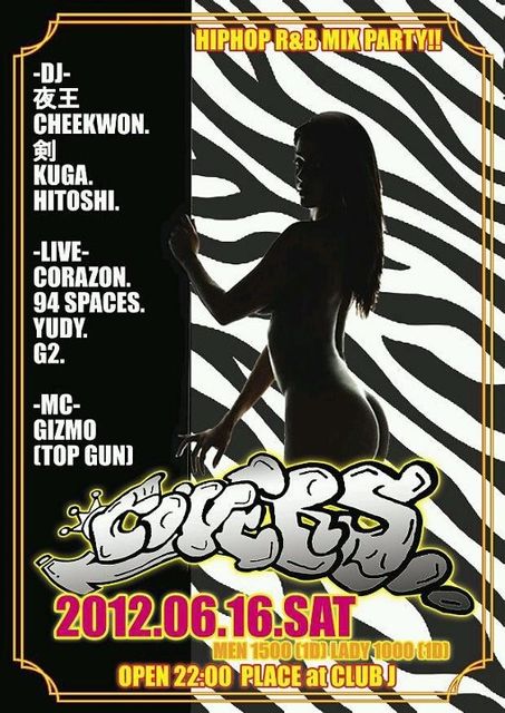 2012.06.16.SAT 【COVERS】 Place At CLUB J MEN1500(1D) LADY1000(1D) OPEN 22:00〜 -DJ- 夜王. CHEEKWON. 剣. KUGA. HITOSHI. -LIVE- CORAZON. 94SPACES. YUDY. G2. -MC- GIZMO(TOP GUN) 前回復活を果たし大盛り上がりで終了したCOVERS 今月もやっちゃいます!! 早い時間からのご来場おまちしております なお当日は、風営法改正の署名運動も行いますので是非ご協力お願いします!! それではお待ちしています!!!!