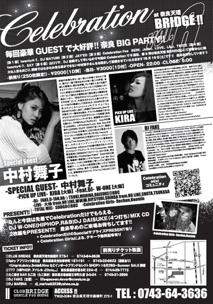 告知失礼します。 GUEST 中村舞子 【タイトル】 Celebration vol.6 【日時】 6月16日【土】 22:00〜5:00 【場所】 奈良天理@BRIDGE 奈良県天理市嘉幡町272-1 0743-64-3636 【料金】 前売り \2000【1D別】当日 \3000【1D込み】※前売り250枚限定 【特典】 なんと今回は先着で、DJ W-ONE(HIPHOP.R&B)DJ DAISUKE(4つ打ち)MIX CD 2枚組をPRESENT 更に CelebrationだけのSpecialサプライズPRESENT有り Celebration Girls
