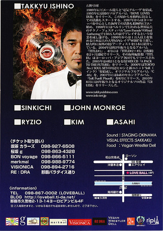 http://loveball.ti-da.net/e3866919.html ◇OPEN◇ 22:00-last ◇入場料金◇ 前売り 2500yen/2drinks 当日 2500yen/1drinks ◇GUEST DJ◇ TAKKYU ISHINO ◇DJ◇ SINKICHI JOHN MONROE RYUZIO KIM ASAHI ◇Sound◇ S.O.L ◇VISUAL EFECTS◇ SAKKAKU ◇FOOD◇ Vegan Wrestler Dell http://loveball.ti-da.net/e3866919.html ◇チケット取り扱い◇ 喫茶カラーズ 098-927-6508 桜坂 g 098-863-4328 BON voyage 098-866-5111 merkmal 098-988-9774 VISIONICA 098-894-
