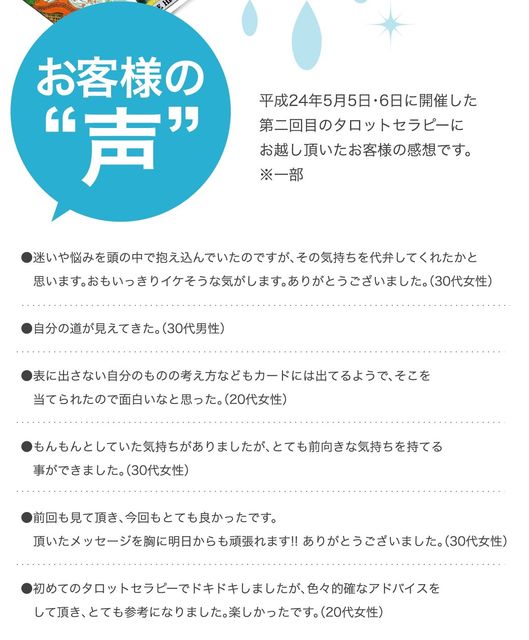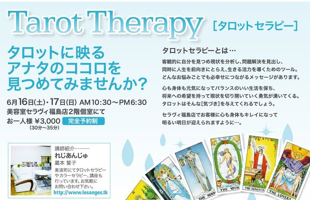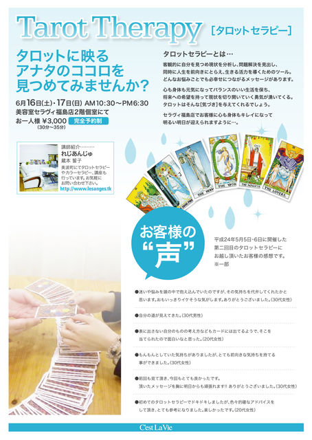 「タロットセラピー"第3弾"」のご案内!! 第1弾、2弾ともに大好評で"感動のお声"の多かった「タロットセラピー」の第3弾が、来月6月16日(土)・17日(日)の2日間開催決定しました★ ーーーーーーーーーーーーーーーーーーーーーーーー 講師紹介・・・・・ 『れじあんじゅ』 オーナー / 蔵本 誓子 美波町にてタロットセラピーやカラーセラピー、講師も行っています。 ※当サロンホームページ『れじあんじゅ』リンク http://salon-cestlavie.com/ ーーーーーーーーーーーーーーーーーーーーーーーー 5月16日(土)・17日(日) 美容室セラ
