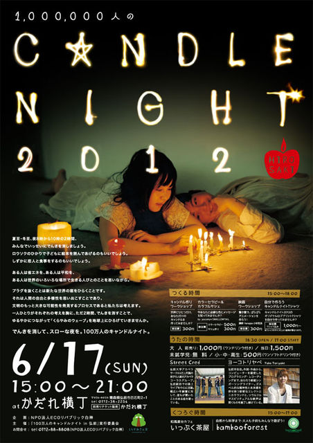 【100万人のキャンドルナイトin弘前2012】 〜でんきを消して、スローな夜を〜 私たちは100万人のキャンドルナイトを呼びかけます。 夏至・冬至、夜8時から10時の2時間、 みんなでいっせいにでんきを消しましょう。 ロウソクのひかりで子どもに絵本を読んであげるのもいいでしょう。 しずかに恋人と食事をするのもいいでしょう。 ある人は省エネを、ある人は平和を、 ある人は世界のいろいろな場所で生きる人びとのことを思いながら。 プラグを抜くことは新たな世界の窓をひらくことです。 それは人間の自由と多様性を思いおこすことで
