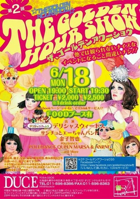 ※scarsは出演しません。 18日、急遽ミッシェルガンエレファントのコピーバンドでのライブが決まりました。 デリシャスウィートスも出ます。 今回は前売り予約の連絡ください。 『THEE MICHAEL GUN ELEMENT』 Vo.ジョマ(Pistol Boogie Vincent) G.リンダ(scars) B.オリーブ(scars) Dr.マツシタタカトシ(ザ・ダメド) 第2回 ザ・ゴールデンアワーショウ 日 時:2012年 6月 18日(月) 会 場:DUCE 札幌市中央区南8条西4丁目422オリエンタルホテルB1F 開 場:19:00 開 演:19:30 チケット:前売