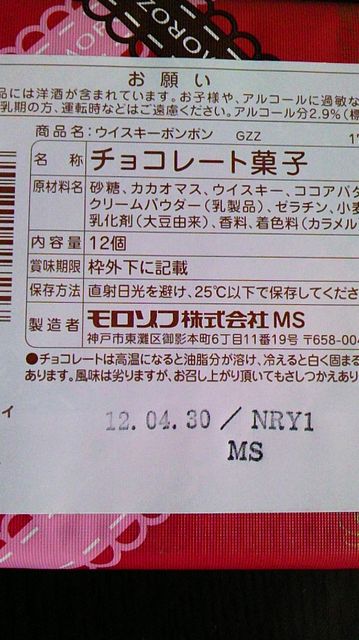 いつもお世話になっています。 前回はヴィトンのバック【あげます】でお世話になりました☆ 今回は、モロゾフのウイスキーボンボンチョコレートの【あげます】です。 私の祖母が生協で頼んだもので、『あんたから旦那にあげたら?』と渡されたのですが、私は毎年手作りして旦那や周りに配っているので余ってしまいました(>_<) 自分で食べようかとも思いましたが、ウイスキーは苦手で食べれません(旦那も) 捨ててしまうのももったいないので、どなたか一名さまにプレゼントしたいと思います。 今回はバレンタインということで、送料無料です。