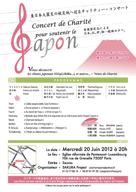 入場料は5ユーロ(このコンサートの収益金は日本大使館を通し、日本赤十字社に寄付されます)