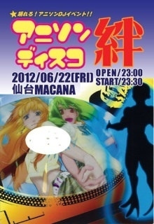 管理人様、コミュニティーの皆様、告知失礼いたします! 私が出演しますアニソンDJイベントの宣伝です! 2012年6月22日(金) ☆コスプレ大歓迎☆ 踊れる!アニソンエンターテイメントDJイベント! 「アニソンディスコin仙台〜絆(KIZUNA)〜マクロス特盛り!」 ■会場/仙台MACANA http://www.macana.net 〒980-0803 仙台市青葉区一番町2丁目5-1大一野村ビルB1F TEL 022-262-4787 ■時間:OPEN 23:00 / START 23:30 ※23:00 男性女性 プレイガイド整理番号順に入場。 ※23:30 イベントスタート ■料金: 前売 2000円(+1D)