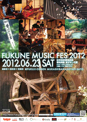 FUKUNE MUSIC FES 2012 森林浴×温泉浴×音楽浴 澄み切った空気のもとで聞く 澄んだ響き 都会では聞けない雑音のない音の本質 何もない山里の地で流れる音楽と温泉に癒されるひとときを 〜山の静寂に包まれた秘境での音楽祭〜 北アルプスの麓、奥飛騨温泉郷福地温泉。 わずか12軒の温泉宿が寄り集まった山里の温泉地では、ただただ、静かな時間がながれます。会場は福地温泉の中心【昔ばなしの里】古民家造りの囲炉裏の間をステージに半屋外イベントとして開催いたします。当日のライブの他にも福地温泉の旅館での