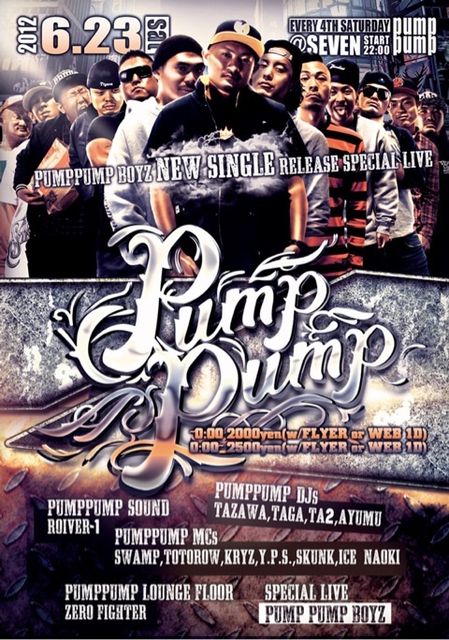 管理人様、突然の告知失礼致します。 今月のPUMP PUMPは7月に発売されるPUMP PUMP BOYZの新曲サマーチューンを一足早くお披露目ライブしちゃいます!! そして今回も勿論、フロアにはサウンドシステム【BLUE-SKY 08】を投入し、フロアに良質な爆音をお届け!映像や照明も駆使したHIPHOPパーティーはPUMP PUMPならではのフロアーになってます! 是非ご来場下さい! 6.23(SAT) START 22:00 @SEVEN (中央区東堀前通り8番町1371ビックナイトビル7F) 〜0:00までに入場 \2,000 0:00以降〜 \2,500 (With FLYER or WEB 1D) LIVE :