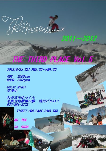 さああああああああ 来た来た来たああああああ 5月病も初夏バテも吹っ飛ぶ 超アゲアゲイベント! THE THIRD PLACE Vol.5 !!! 恒例のクラブ貸切ダンスイベントで〜す! この日に今シーズンのダイジェストDVDを 試写上映いたしま〜す! ゲストで大物プロライダーのサプライズ招待あります! そのほかプロダンサーや有名DJも呼ぶ予定です! 「ミクシィ見ました!」って感じの飛び込み参加も大歓迎! TK4今期新加入のメンバーの歓迎会でもありますんでね! コミュに入