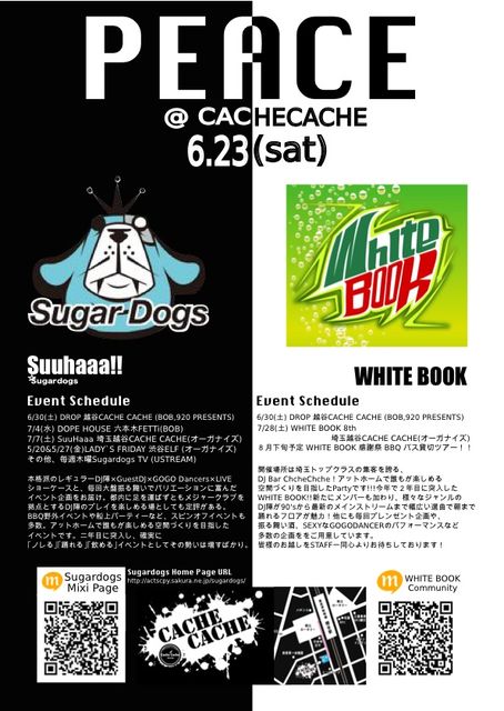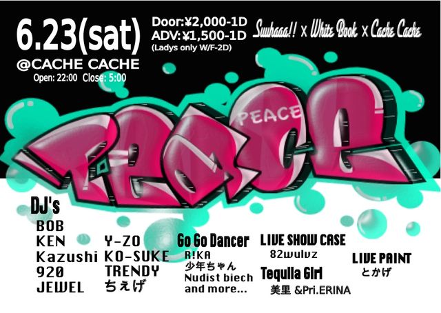 開催場所は埼玉トップクラスの集客を誇る、越谷ChcheChche! 半年に一回のSpecial Party!! SuuHaaa!!&WHITE BOOKの合同EVENT【PEACE!!】が遂に2回目の開催!! ここでしか見られない各EVENT レギュラー出演者の競演!! 〜SuuHaaa!!×WHITE BOOK Presents.〜 【PEACE!!】 @越谷CACHE CACHE DATE: 2012.6.23.SAT TIME: OPEN 22:00 CLOSE 5:00 PRICE: DOOR/2000yen-1D ADV 1500-1D(Ladys only W/F‐2D) GENRE: Hip Hop/R&B/Reggae/Good Music/etc... 【DJs】 BOB KEN KAZUSHI 920 JEWEL Y-ZO TREND