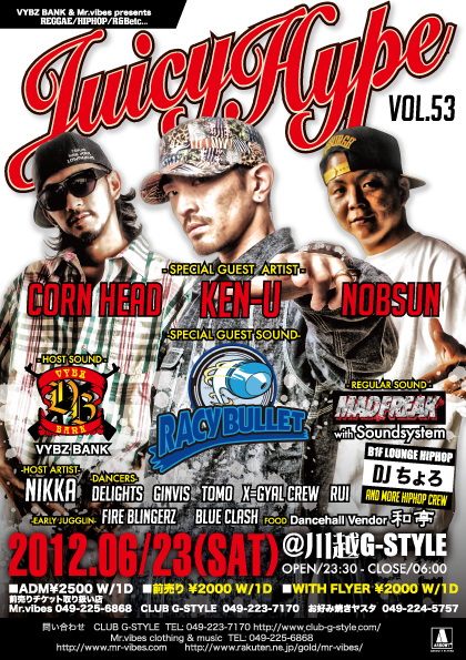 JUICY HYPE vol.53 2012 6/23(SAT) @G-STYLE (埼玉県川越市) - SPECIAL GUEST ARTIST - KEN-U CORN HEAD NOBSUN - SPECIAL GUEST SOUND - RACY BULLET -REGULAR SOUND- MAD FREAK with soundsystem -DANCERS- DELIGHTS GINVIS TOMO X=GYAL CREW RUI -HOST SOUND- VYBZ BANK -HOST ARTIST- NIKKA -EARLY JUGGLIN- FIRE BLINGERZ BLUE CLASH -FOOD- Dancehall Vendor 和亭 -B1F LOUNGE HIPHOP- DJ ちょ