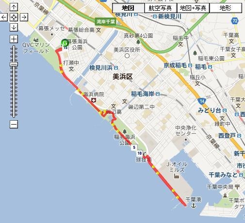 長い距離をゆっくり走るLSD(Long Slow Distance)を行います。 ペースは、1キロ7分 待ち合わせ場所は、以前のイベントと同じ場所。 http://mixi.jp/view_event.pl?id=69274754&comm_id=567219 集合は朝6時。 6:10〜6:50 (ストレッチと体幹トレーニングによるシェイプアップを実施します) 7:00〜9:30 (LSD キロ7'00 約20km) 朝9時半過ぎ、軽くストレッチを行って終了。 大まかにはこんな感じです。 写真のコースは5月に行ったコース(15km)です。 当日はこのコースに5kmプラスするのでマリンスタジアムの方ま