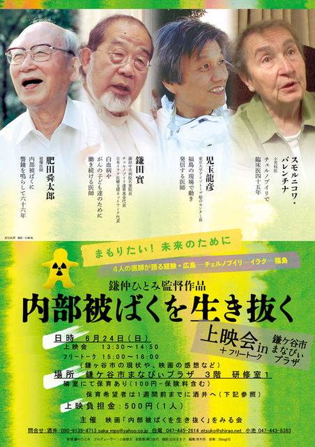 映画「内部被曝を生き抜く」上映会が開催されます。 日時:6月24日(日) 上映会 13:30〜14:50 フリートーク 15:00〜16:00(鎌ヶ谷市の現状や、映画の感想など) 場所:鎌ケ谷市まなびぃプラザ 3階 研修室1 隣室にて保育あり(100円-保険料含む) 保育希望者は1週間前までに酒井 09091354713 か、saka_mpo@yahoo.co.jp までご連絡ください。 上映負担金:500円(1人) 主催: 映画「内部被曝を生き抜く」をみる会 −−−−−−−−−−−−−−−−−−−−−−−−−−−− 2011年3月に起きた東日本大震災によって原発が4つも爆