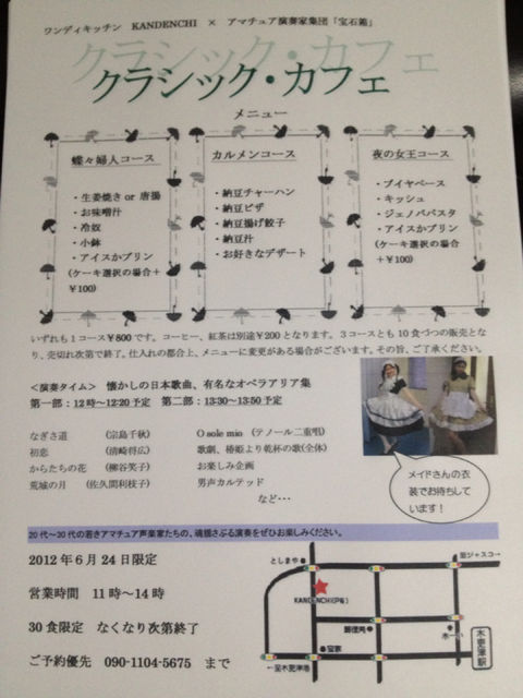2012年6月24日(日) 木更津のワンディキッチンKANDENCHI(木更津市中央2-8-18)にてクラシックカフェやります。 木更津にはなかった「メイドカフェ」となります。不定期開催なので次の日程は未定。 11時からランチメニュー三種類ご用意しています。30食限定、予約埋まり次第終了となります。 〜蝶々婦人コース〜 生姜焼きかから揚げ サラダ 小鉢 冷奴 アイスかプリン(ケーキ選択時は+100円) 〜カルメンコース〜 納豆チャーハン 納豆揚げ餃子 納豆ピザ 納豆汁 お好きなデザート 〜夜の女王コース〜 ブイヤベ