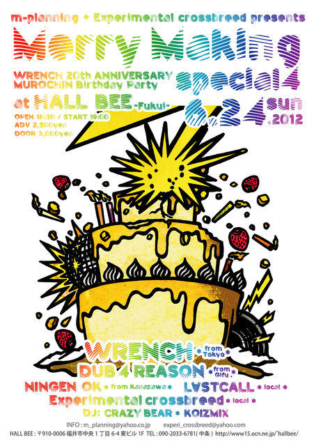 m-planning + Experimental crossbreed presents “Merry Making special 4” 2012.6.24 (sun) at: HALL BEE (Fukui) OPEN/18:30 START/19:00 ADV/¥2,500 DOOR/¥3,000 (限定100枚) WRENCH (from:Tokyo) DUB 4 REASON (from:Gifu) NINGEN OK (from:Kanazawa) LASTCALL Experimental crossbreed DJ: CRAZY BEAR・KOIZMIX INFO : m_planning@yahoo.co.jp HALL BEE : 〒910-0006 福井市中央1丁目6-4 東ビル1F TEL:090-2033-6781(中条) http://www15.ocn.ne.jp/~hallbee/ 【チケット取扱店】 HALL BEE (中