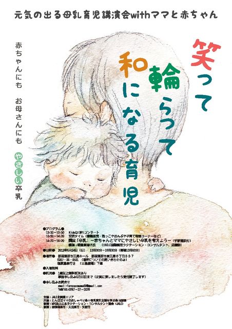 転送、シェア、大歓迎 当日突然参加も大歓迎 那須高原へご家族でお出かけください〜〜 〜赤ちゃんにも お母さんにも やさしい卒乳〜 ●プログラム● 第一部 Kidsな(絆)コンサート 交流タイム (バルーンアートコーナー・書籍販売・子育て相談コーナーなど) 第二部 母乳育児講演会 「卒乳」 朝倉真理子(IBCLC・助産師) ★手話通訳付★ ●日時● 2012年6月24日(日) 13時30分〜16時30分(開場13時00分) ●場所● 那須塩原市三島ホール 栃木県那須塩原市東三島6丁目337