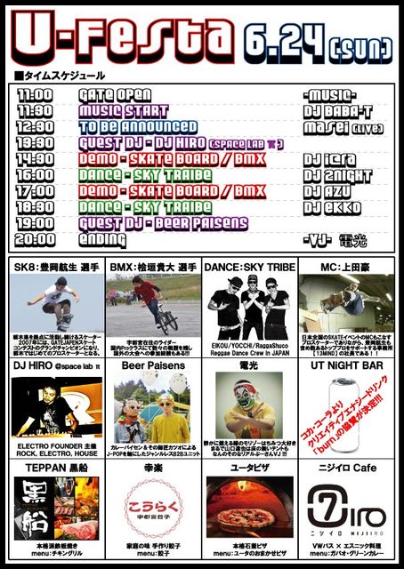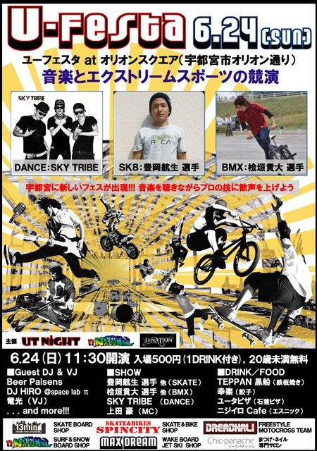 管理人様、スペースをお借りいたします。 「U-Festa at オリオンスクエア」 詳細→http://ufesta.jpn.org/ 宇都宮に新感覚のフェスが出現!!!音楽とエクストリームスポーツの競演!!! 一流プロの技×音楽をベースに、シェフの作るグルメ、カクテル、趣味、 日常を満足させるには欠かせないアイテムをドーンとオリオンスクエアに集結! スケートボード、BMX、スノーボード、サーフィン、ウェイクボード、カヌー フリースタイルモトクロス、ダンス、ネイルアート 今、以上に楽しみたい!