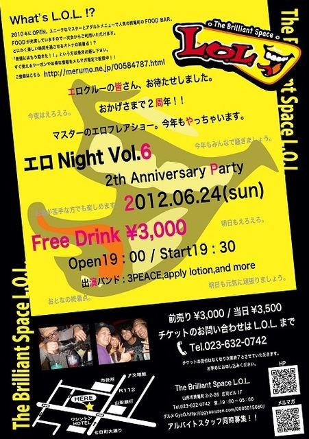 2012.6.24(sun) The Brilliant Space L.O.L 2th Anniversary Party エロNight vol.6 Free Drink 前売り\3,000/当日\3,500 Open 19:00/Start 19:30 お問い合わせはLOLまでお願いします。 山形市旅篭町2-2-26 庄司ビル1F Tel: 023-632-0742