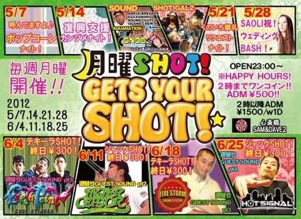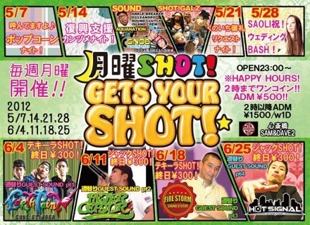 ※大阪月曜日!至高のレゲエPARTYスタイル! ”月曜SHOT!”〜GETS YOUR SHOT!〜 週明けからガンガン上がってま〜す!!! クラブ好きも!音好きも!お酒好きも! 誰もが遊べる!楽しめる!”月曜SHOT!” 男子も女子もみんな2時まで\500ポッキリ! みんながお得!ワンコイン入場のHAPPY HOURS! 知ってるひとはお早めからお楽しみです! さらにサプライズで大好評の ドリンクのディスカウントも飛び出し中! BARカウンターが常大忙しです! GALはかわいくMENSの振る舞い酒〜 毎週替わりの企画もご用意してます! 5〜6月も乞うご期
