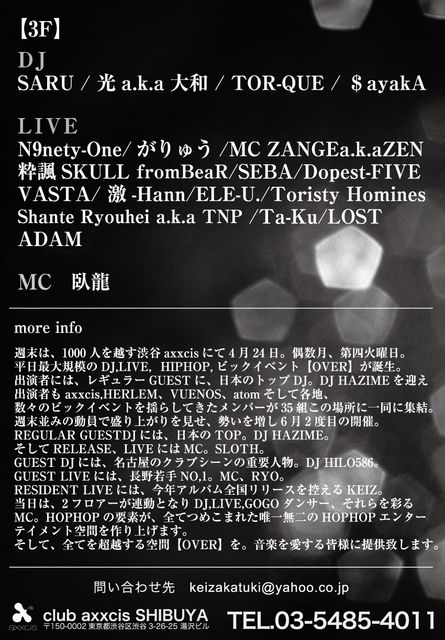 ■平日最大規模,ビックイベント■ ●●●KEIZ(ケイズ)のゲストで暁(アカツキ)で どなた様でもディスカウントできます。●●● 確実にゲストおとりされたい方は メッセージ頂ければと思います。 メッセージお待ちしております。 渋谷に●都内最大規模●ビックイベントが誕生します。 渋谷axxcis【OVER】 フロアを沸かすのは イベント日本のトップDJ DJ HAZIME!!! その他、2F、3F2フロアー連動になり 総勢35組の出演者!!! 確実に盛り上げます!!! 色々な事を忘れて、また次の日