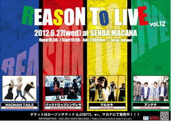 [告知失礼します] 【REASON TO LIVE vol.12】 この度12回目を迎えアンテナに出演いただけます◎ 2012.6.27(水) @ 仙台MACANA *act* ◆アンテナ ◆バックドロップシンデレラ ◆MADMAN TAILS ◆アルカラ 全4band MC:YUTA×MIYUKI photo by mikitty* DJ:SO-ON(MIDORI×AYUMI) OPEN 18:30 START 19:00 \2,300- (drink代\500-) チケット発売中▽ ■ローソンチケット(Lコード:25877) ■イープラス ■MACANA店頭 ■各バンド公式HP ■REASON TO LIVE HP REASON TO LIVE オフィシャルサイト http://reasontolive.web.fc2.com/ チ