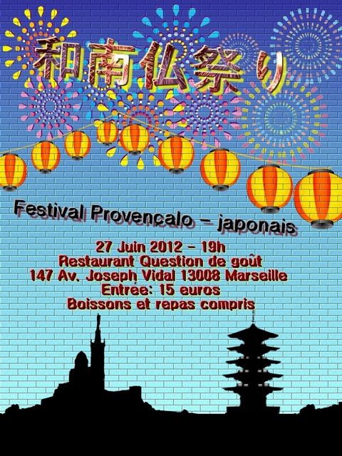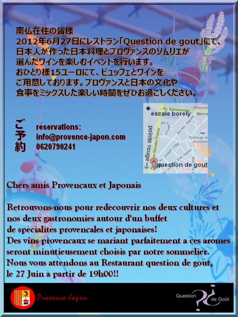 管理人様、貴重なスペースありがとうございます。 2012年6月27日(水)19:00よりマルセイユのレストランQuestion de goûtにて、イベントを行います。 15ユーロにてビュッフェとマルセイユ出身のソムリエが選んだおいしいワインをお楽しみください。 お子様は4歳以上から5ユーロとさせていただいております。 3歳以下は無料です。 ご予約、お待ちいたしております。 ご予約、問い合わせは、Provence-Japonまでよろしくお願いいたします。 ご予約の際は、お名前、ご連絡先、人数をお知らせください。 E-mail:info@provence-japon.c