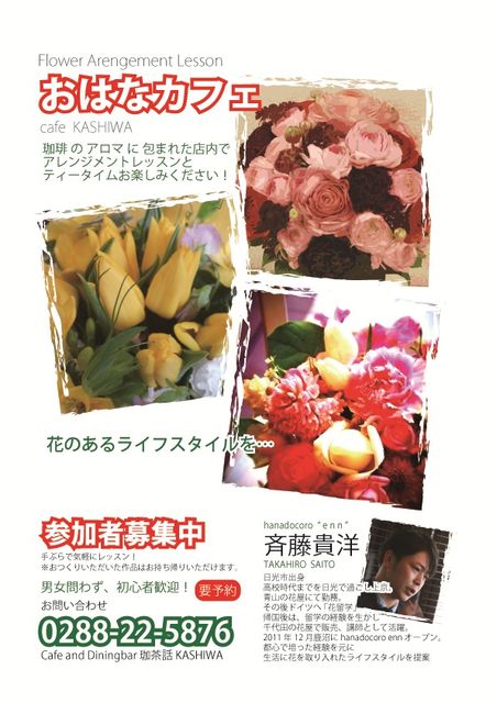 皆様のライフスタイルに花のある風景を提案しようと 毎月店内にて行っているフラワーアレンジメント教室 その名も「おはなカフェ」 季節にあったアレンジメントを作成。 当店自慢の飲み物やケーキを楽しみながら楽しい時間をご提供! 初めての方から熟練の方まで性別問わず、やさしく御指導いたします。 NEXT LESSON 6月27日水曜日 ?14:00 START ?19:00 START 6月の会 ひまわりを使ったアレンジメント お一人様 4000円 + 1オーダー *花材、レッスンに加え珈茶話のオリジナルメニューがセットになります!