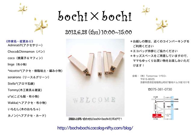 bochi×bochi vol.9 6/28( 木)10:00〜15:00 京都市西京区 桂川街道沿い ツモローにて 室内なので雨天決行です! キッズスペースやトイレもあるのでお子様連れのママもゆっくりお買い物を楽しんでくださいね!!! <参加予定の作家さん> Admiratif!(アクセサリー) Choco&Chinnamon(パン) coco(焼菓子&マフィン) linge(布小物) *nicotto*(アクセ・樹脂粘土・編み小物) sorairono(リース&グリーン) Stella*(アロマ石鹸) Tommy(木工家具&雑貨) u*a(こども服・布小物)