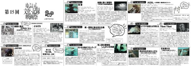 今年の「ゆふいん文化・記録映画祭」の上映作品、ゲストのラインナップが決まりました。 今年は上映作品14本、また多彩なゲストをお迎えし、 シンポジウムやゲストトークも充実です。 詳しくは下記HPをご参照下さい。 http://movie.geocities.jp/nocyufuin/15th/15th.html リーフレットの送付をご希望の方は、送付先と必要部数をご連絡下さい。 すぐにお送り致します。 なお、「第5回松川賞」作品については、今月下旬に発表の予定です。 いましばらくお待ち下さい。 今年も新緑と蛍の由布院盆地にて、 魅力ある映像作品の数々とプロ