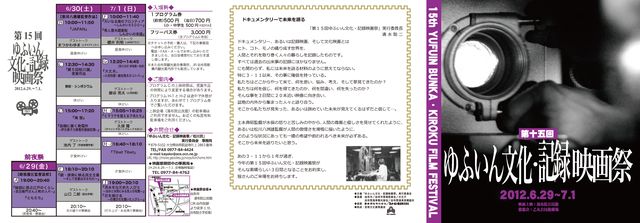 今年の「ゆふいん文化・記録映画祭」の上映作品、ゲストのラインナップが決まりました。 今年は上映作品14本、また多彩なゲストをお迎えし、 シンポジウムやゲストトークも充実です。 詳しくは下記HPをご参照下さい。 http://movie.geocities.jp/nocyufuin/15th/15th.html リーフレットの送付をご希望の方は、送付先と必要部数をご連絡下さい。 すぐにお送り致します。 なお、「第5回松川賞」作品については、今月下旬に発表の予定です。 いましばらくお待ち下さい。 今年も新緑と蛍の由布院盆地にて、 魅力ある映像作品の