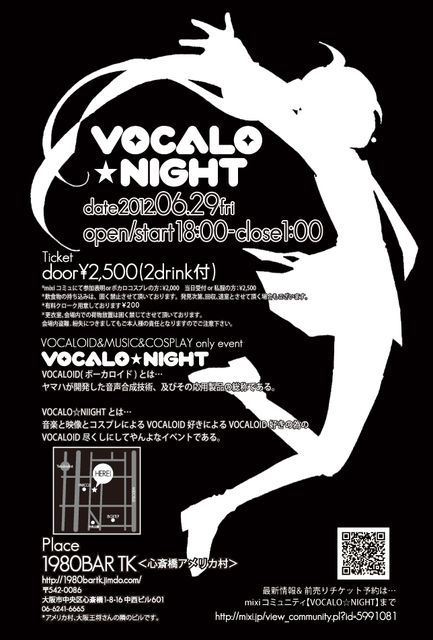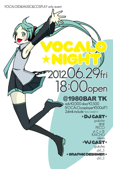 VOCALOID&MUSIC&COSPLAY only event 【VOCALO☆NIGHT】 VOCALOID(ボーカロイド)とは… ヤマハが開発した音声合成技術、及びその応用製品の総称である。 VOCALO☆NIGHTとは… 音楽と映像とコスプレによるVOCALOID好きによるVOCALOID好きの為のVOCALOID尽くしにしてやんよなイベントである 【開催日時】 2012年6月29日(金) 〈OPEN〉 18:00 〈START〉 18:30 <CLOSE>1:0